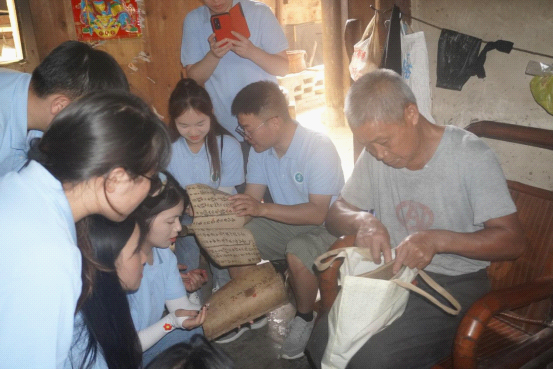 水书是国家级非物质文化遗产,是水族人民的精神内核和支柱,对研究水族社会历史文化具有极为重要价值。团队成员到达怎雷村后,拜访了水书先生韦再军。他告诉了同学们水书的传承情况,并重点讲述了水书在当地的实际应用。